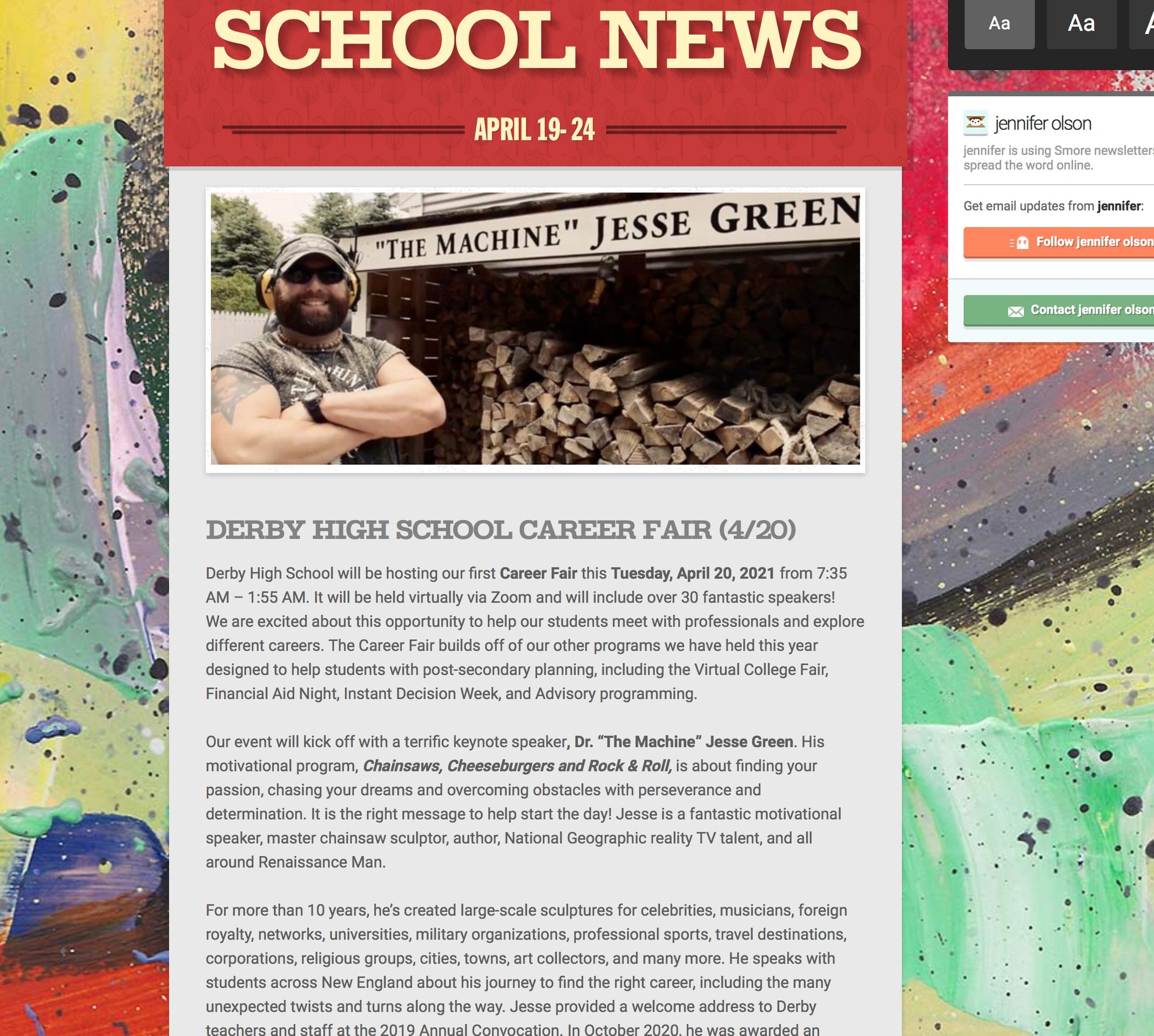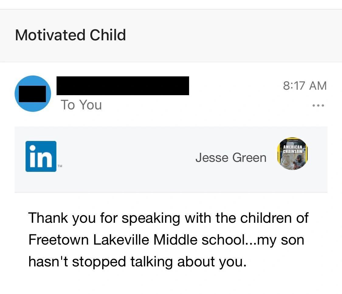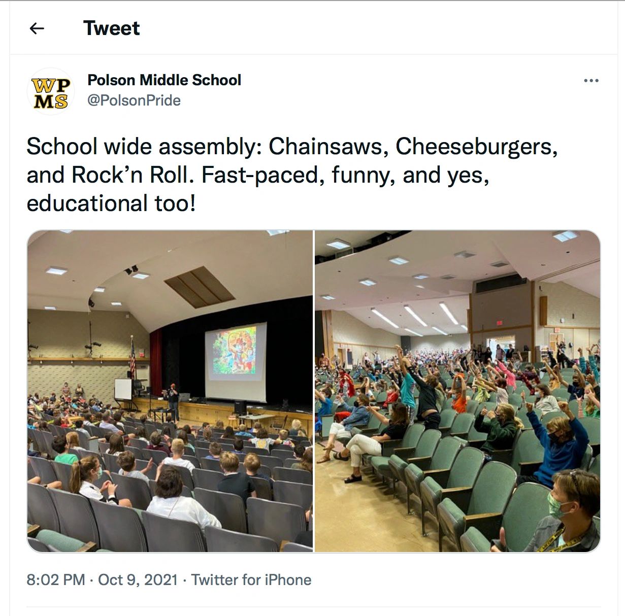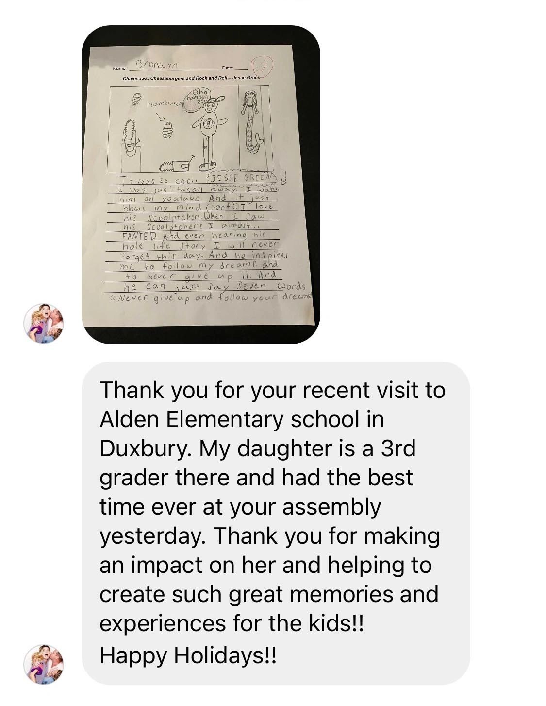 Hi Jesse,On behalf of the 5th grade team, thanks so much for coming to Mayo Elementary this past Friday. Our students thoroughly enjoyed your engaging stories that documented your journey toward fame as a Chainsaw Wood Sculptor. Your energy and enthusiasm were infectious! Your message---to follow your dreams no matter how hard---was powerful and inspiring, and one that our students will carry with them for years to come. Thanks so much for sharing your tales and for inspiring a new generation to reach for the stars.Best Wishes,