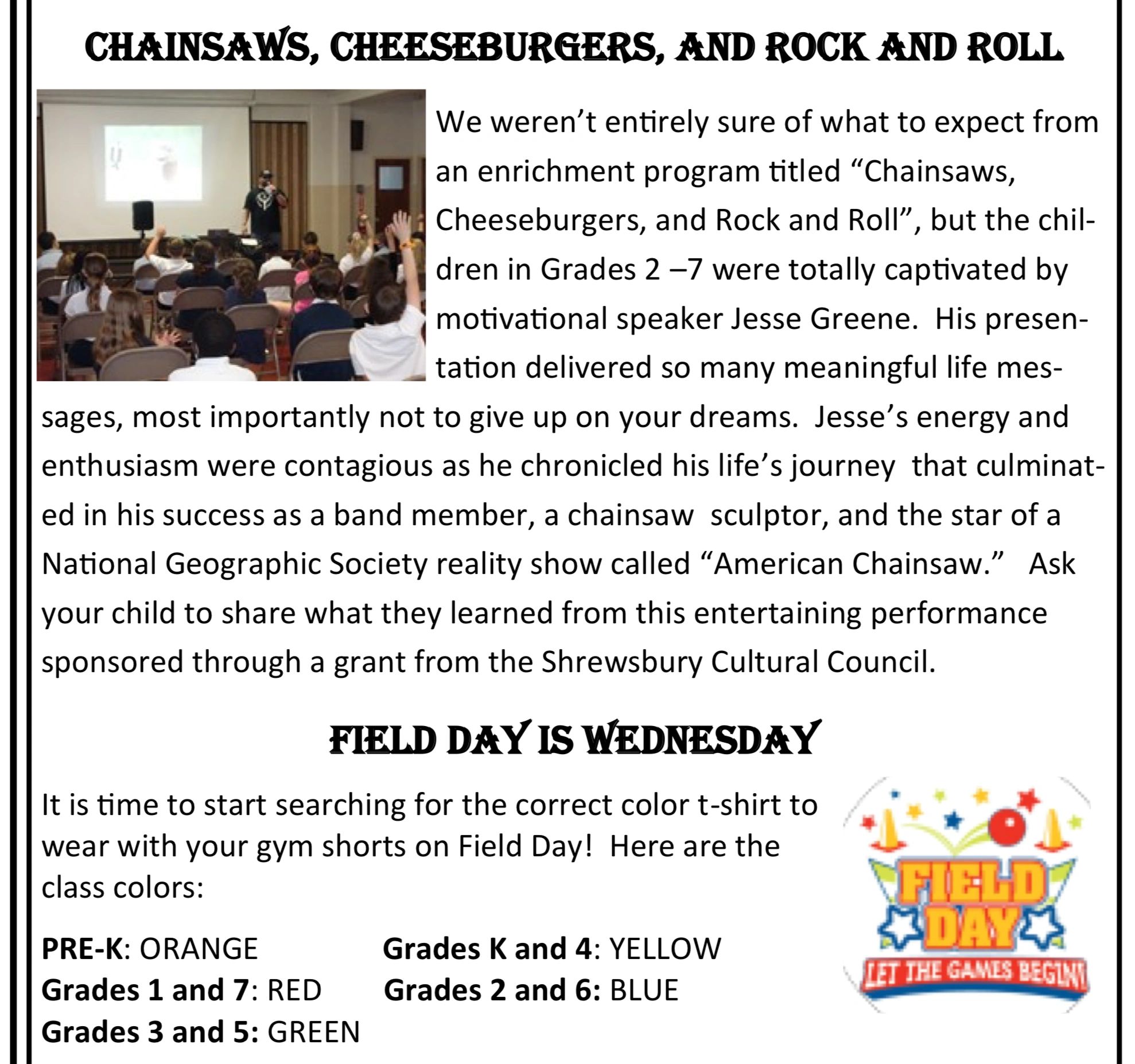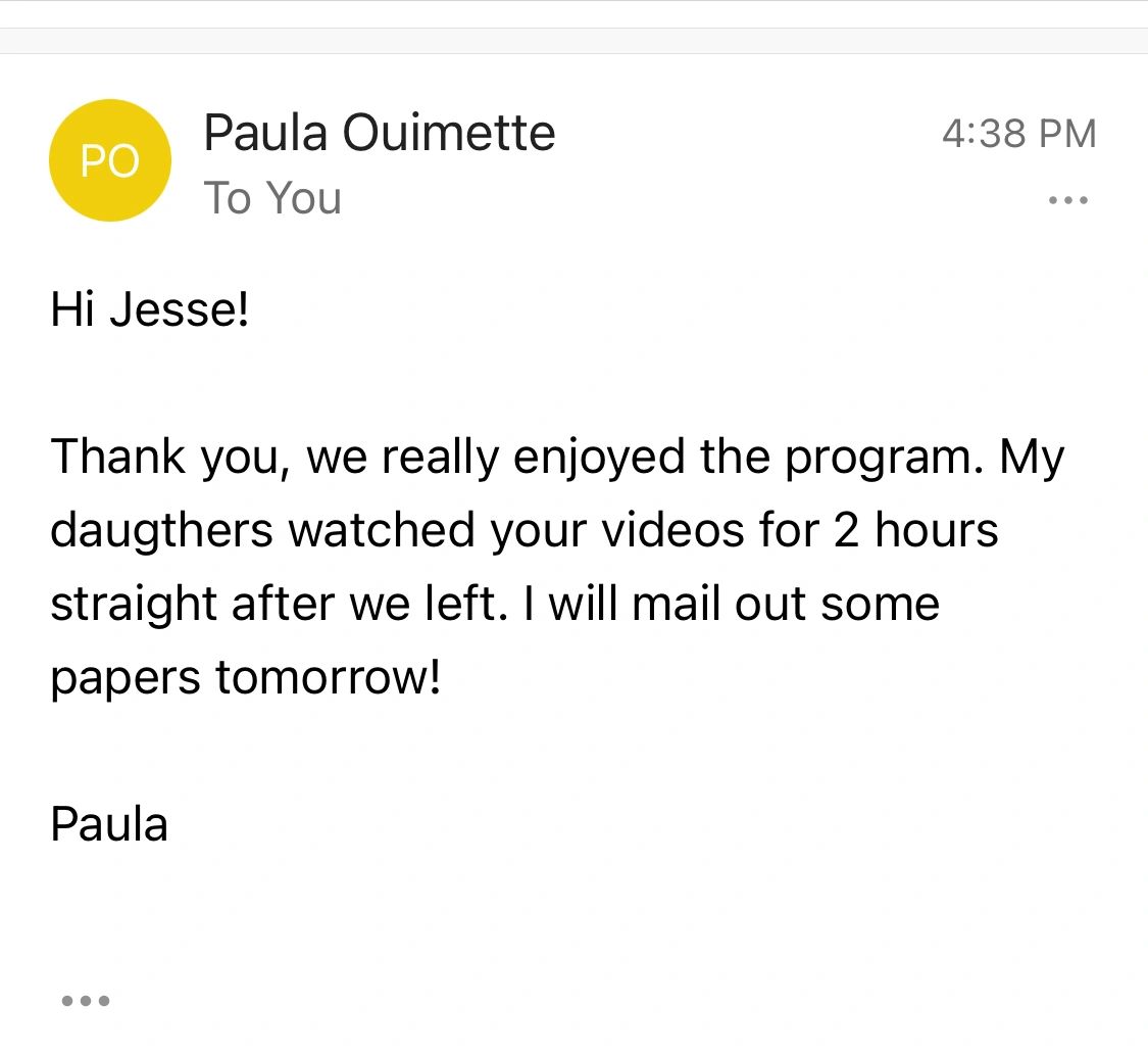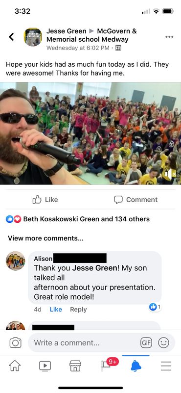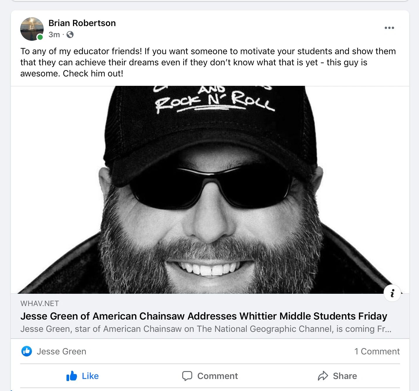 Hi Jesse,On behalf of the 5th grade team, thanks so much for coming to Mayo Elementary this past Friday. Our students thoroughly enjoyed your engaging stories that documented your journey toward fame as a Chainsaw Wood Sculptor. Your energy and enthusiasm were infectious! Your message---to follow your dreams no matter how hard---was powerful and inspiring, and one that our students will carry with them for years to come. Thanks so much for sharing your tales and for inspiring a new generation to reach for the stars.Best Wishes,