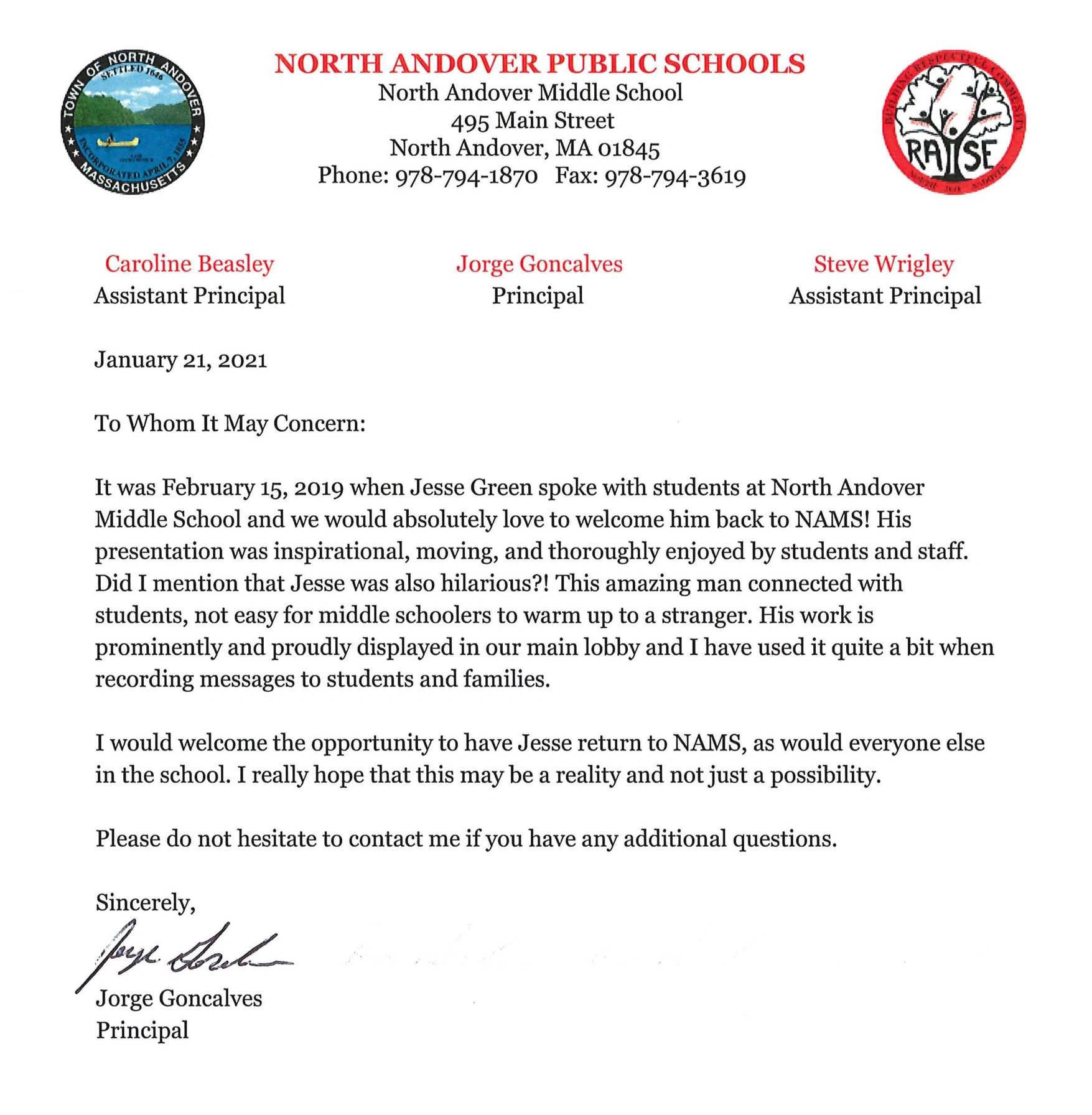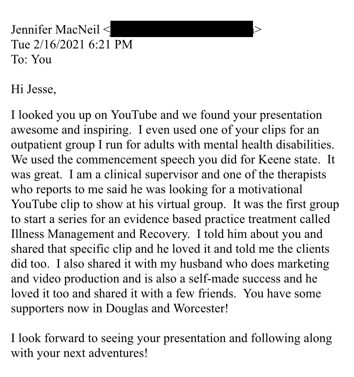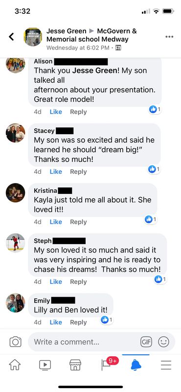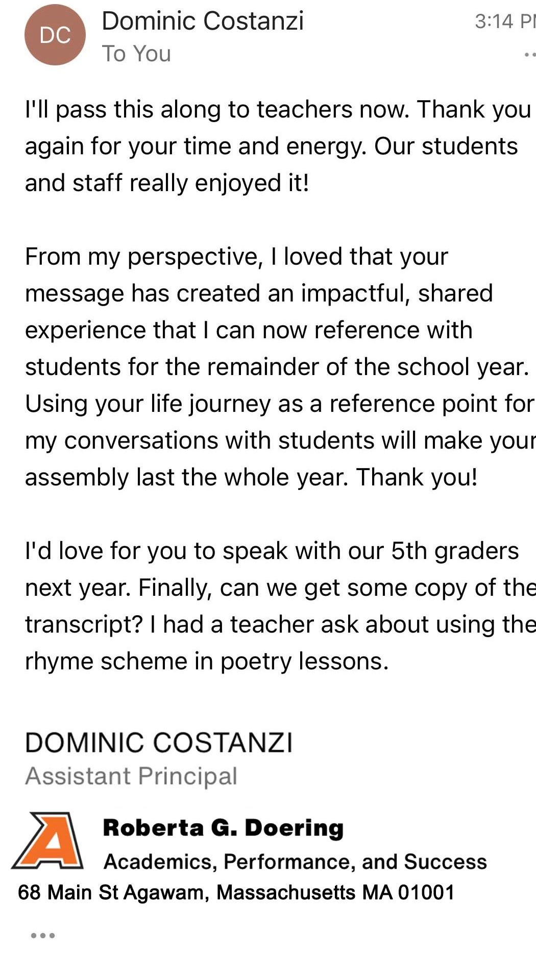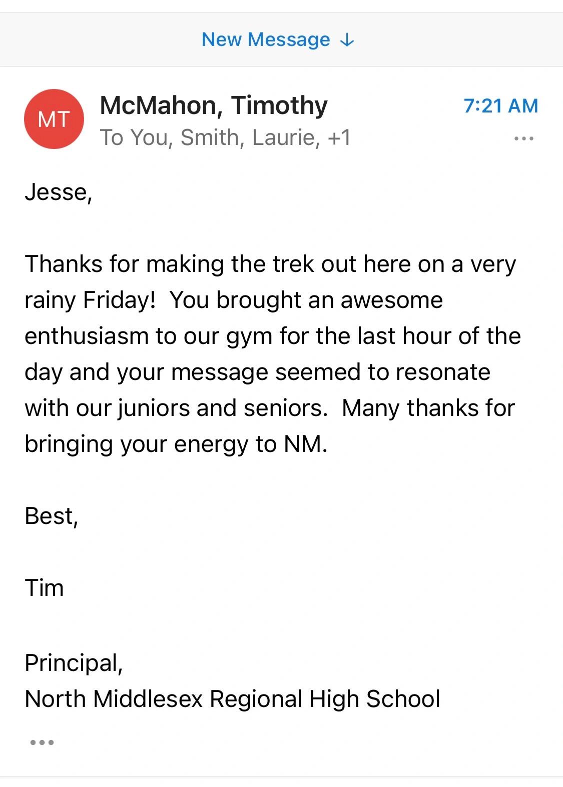Jesse was an incredibly engaging speaker that left our students truly inspired by his life story, his impressive accomplishments, and his strong, empowering messages. The energy and enthusiasm he brought into the room was uplifting, and we are beyond grateful to have heard him speak. He had the students laughing, amazed by his journey, and feeling passionate about pursuing their goals, in which Jesse is living proof that it is possible. He is an awesome speaker, and we are all so pumped to read his books! Thanks so much, Jesse! You rock!!!"