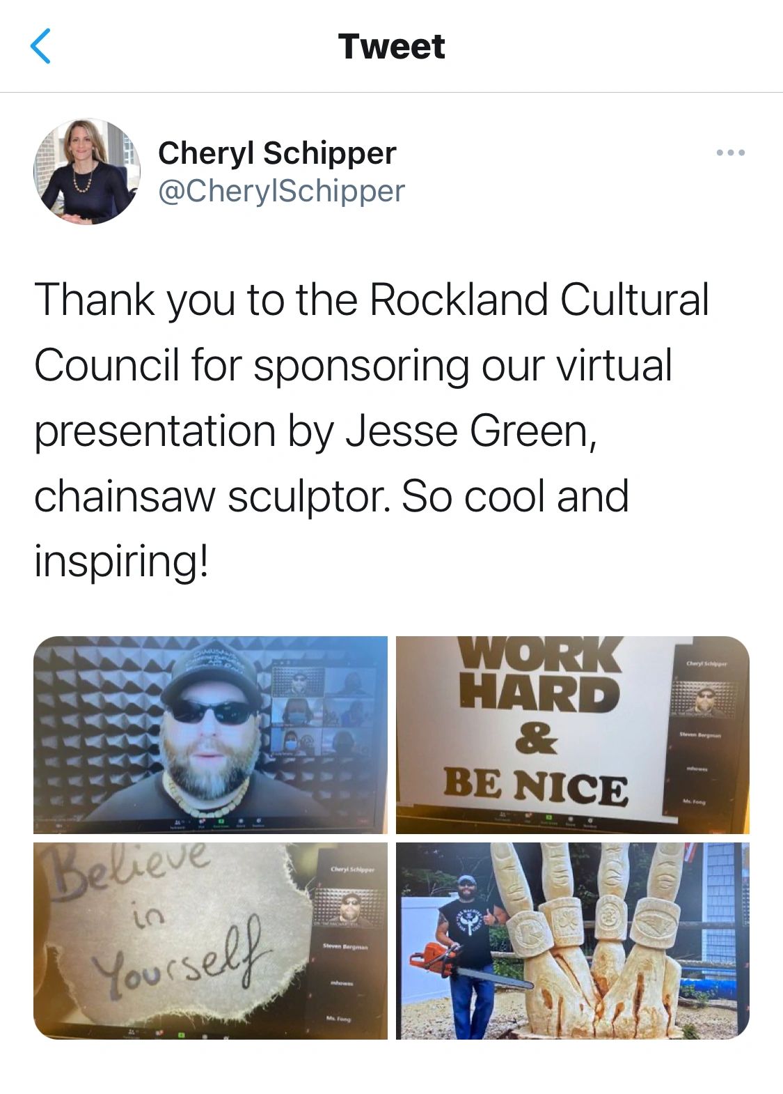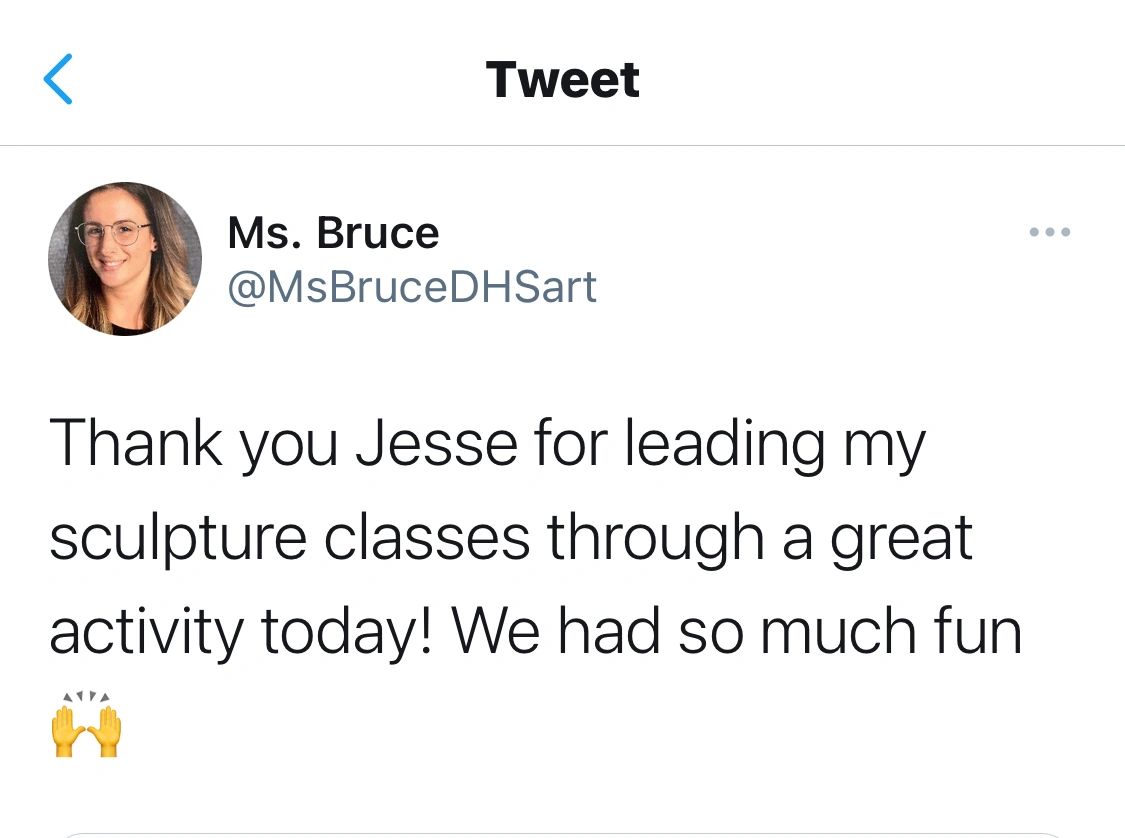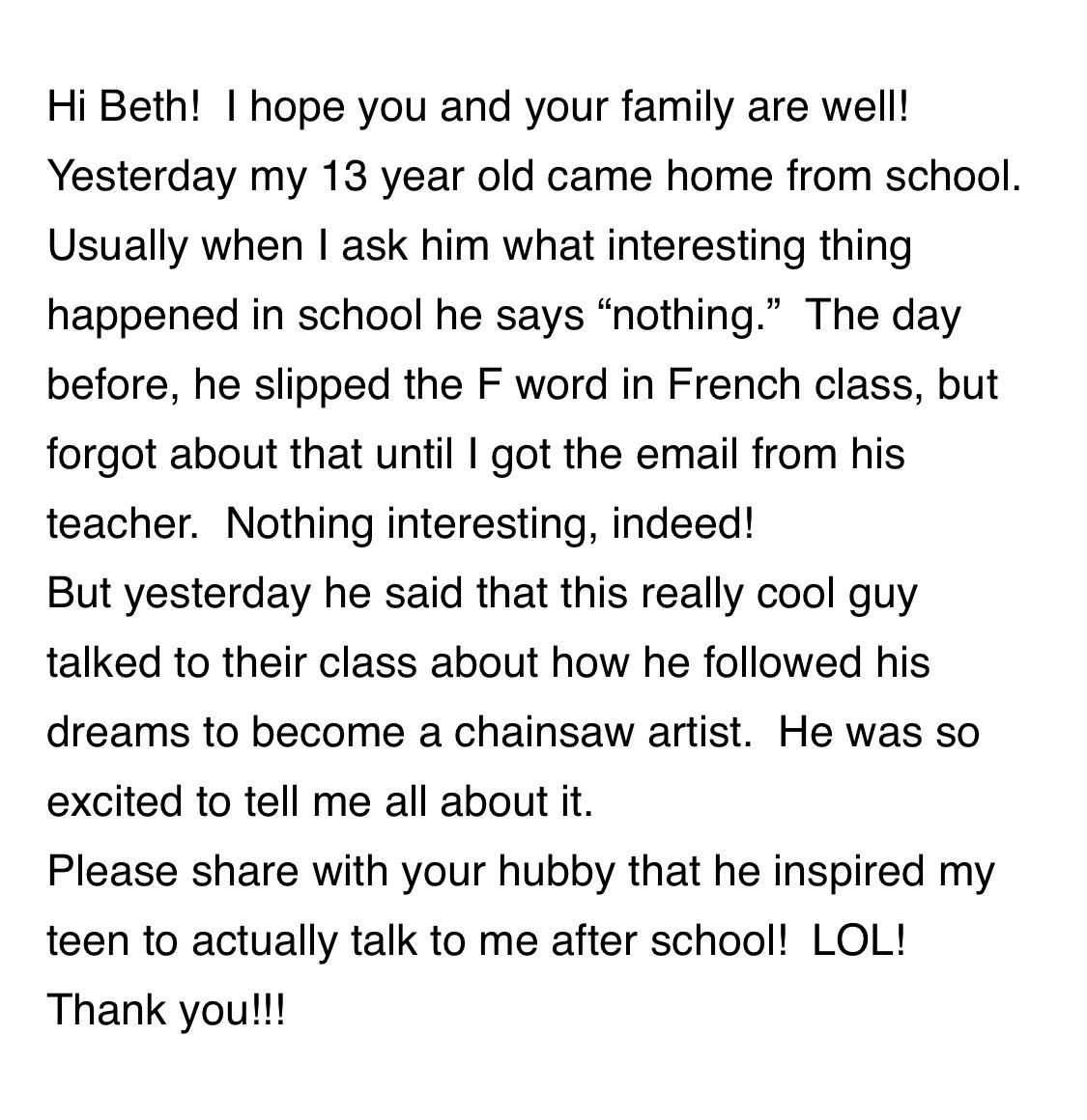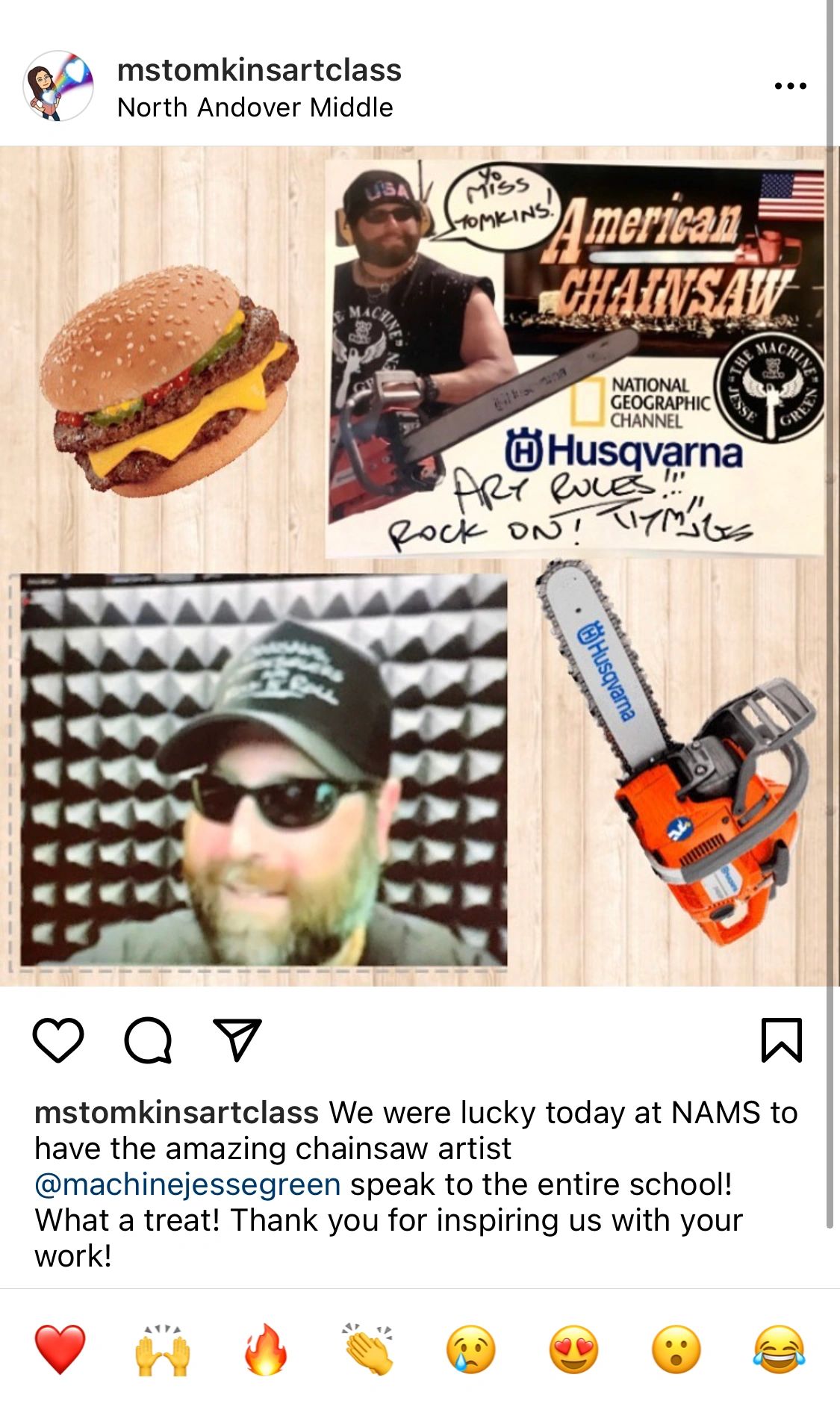"Jesse, I can not thank you enough for speaking with our students yesterday! There were so many highlights: *The round of spontaneous applause you received from our 4th graders.*The energy in the room during your presentation.*Seeing your artwork "come to life" through your photos.*Finally, your AMAZING and personal interaction with one of our students. I've seen many heartwarming moments in my career as a teacher and as a principal and your exchange with one of our students at the end of your presentation was one of the most touching encounters I have experienced. If you ever get tired of working with chainsaws, I would recommend a career working with children!Thanks again for a memorable day!"