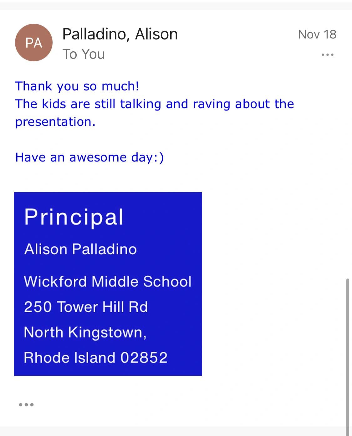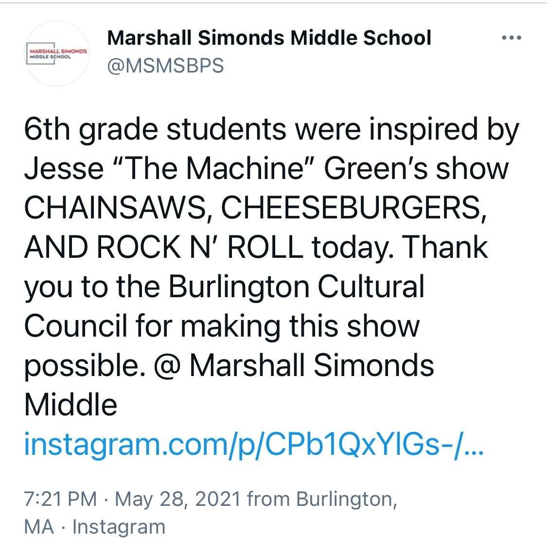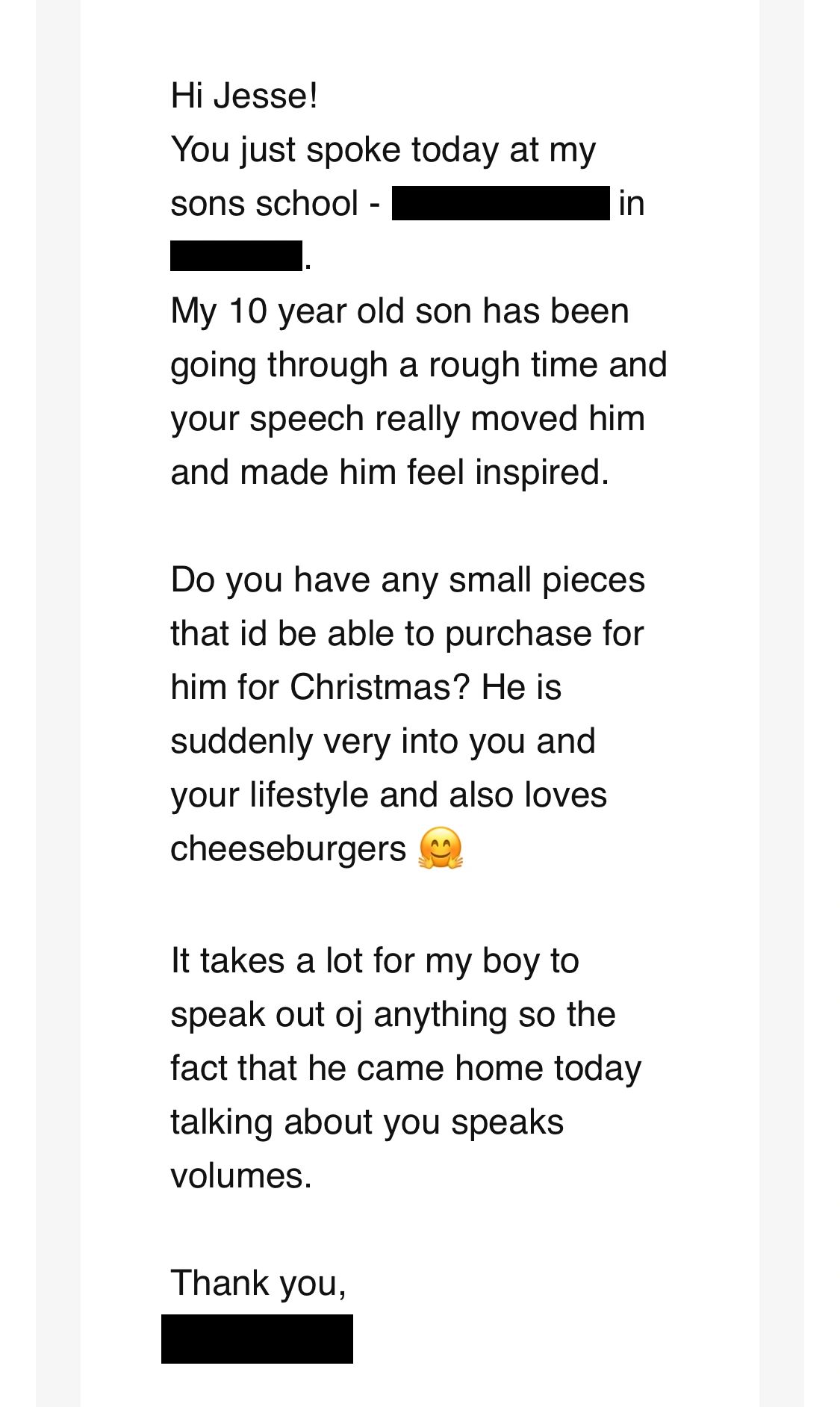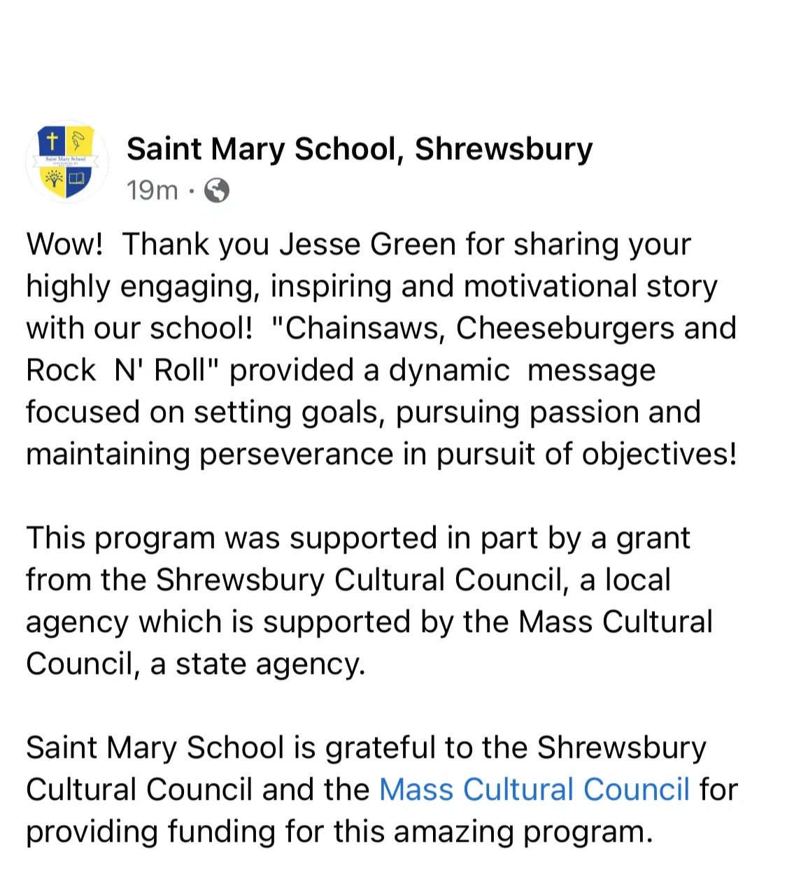 "Jesse, I can not thank you enough for speaking with our students yesterday! There were so many highlights: *The round of spontaneous applause you received from our 4th graders.*The energy in the room during your presentation.*Seeing your artwork "come to life" through your photos.*Finally, your AMAZING and personal interaction with one of our students. I've seen many heartwarming moments in my career as a teacher and as a principal and your exchange with one of our students at the end of your presentation was one of the most touching encounters I have experienced. If you ever get tired of working with chainsaws, I would recommend a career working with children!Thanks again for a memorable day!"