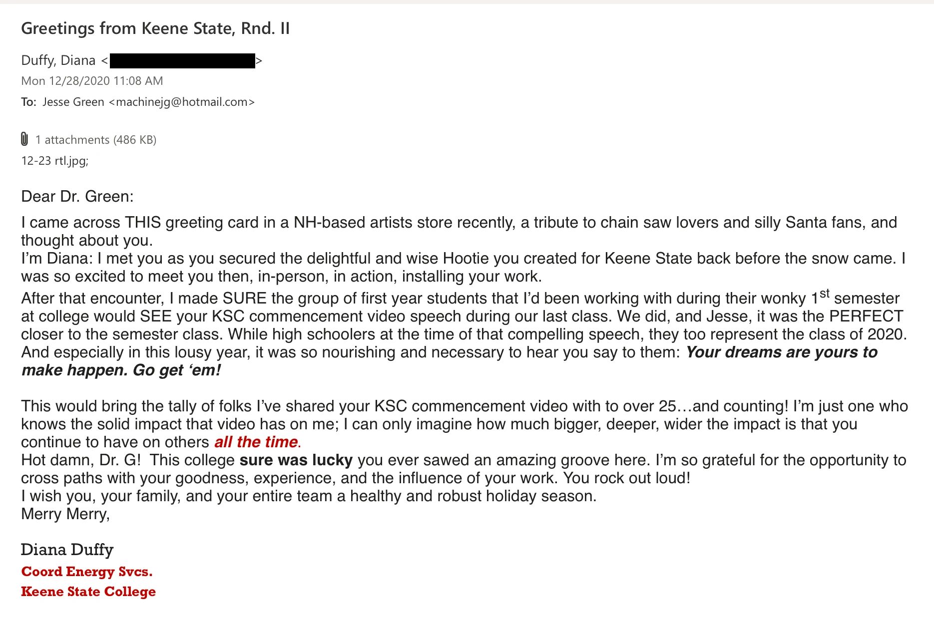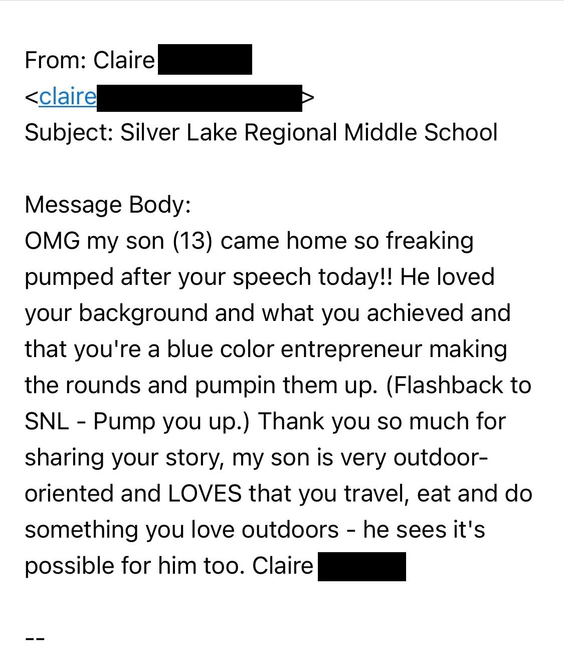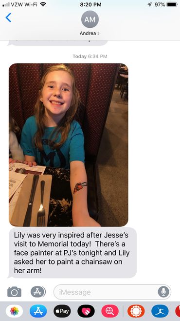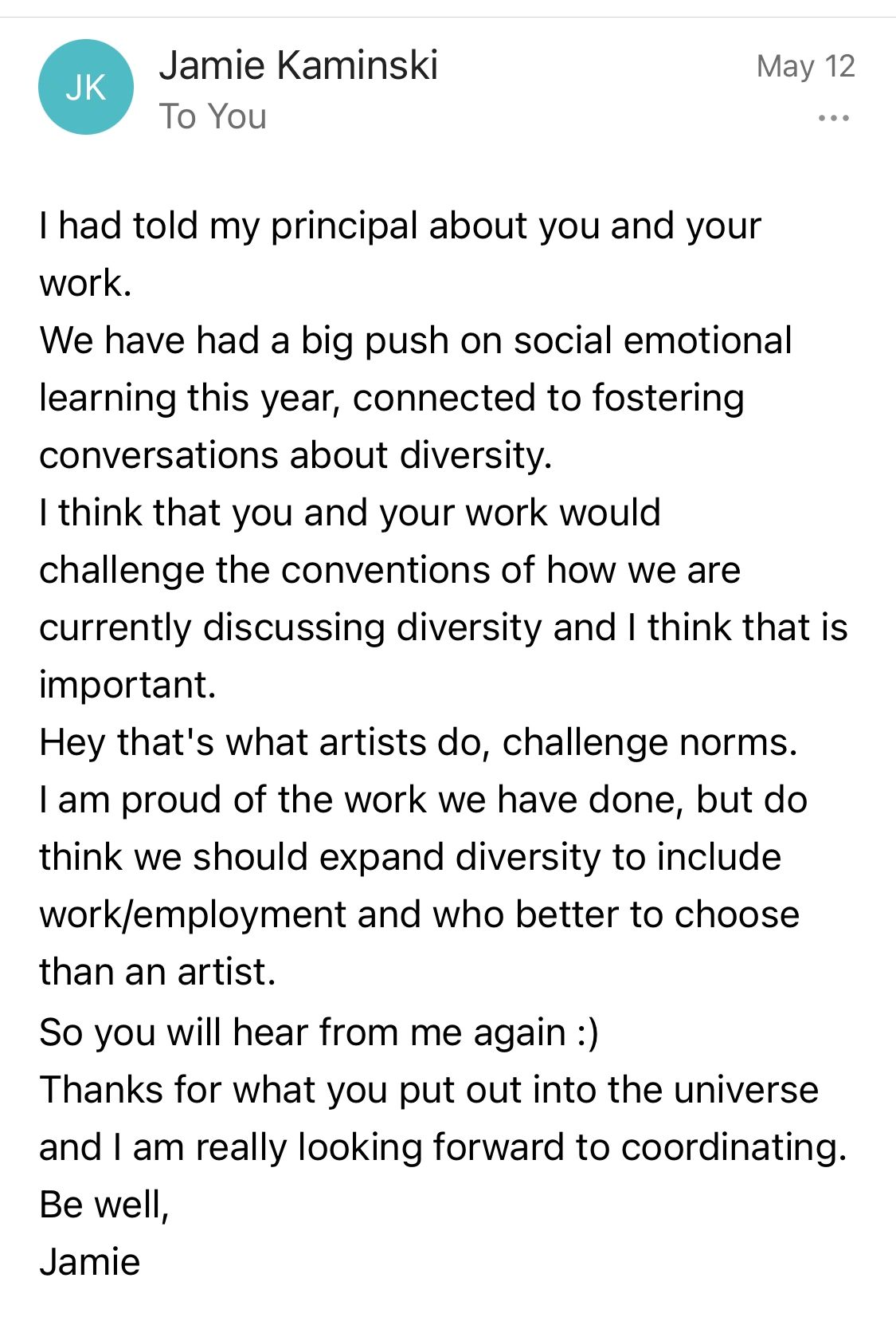"Jesse, I can not thank you enough for speaking with our students yesterday! There were so many highlights: *The round of spontaneous applause you received from our 4th graders.*The energy in the room during your presentation.*Seeing your artwork "come to life" through your photos.*Finally, your AMAZING and personal interaction with one of our students. I've seen many heartwarming moments in my career as a teacher and as a principal and your exchange with one of our students at the end of your presentation was one of the most touching encounters I have experienced. If you ever get tired of working with chainsaws, I would recommend a career working with children!Thanks again for a memorable day!"