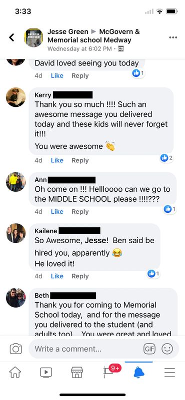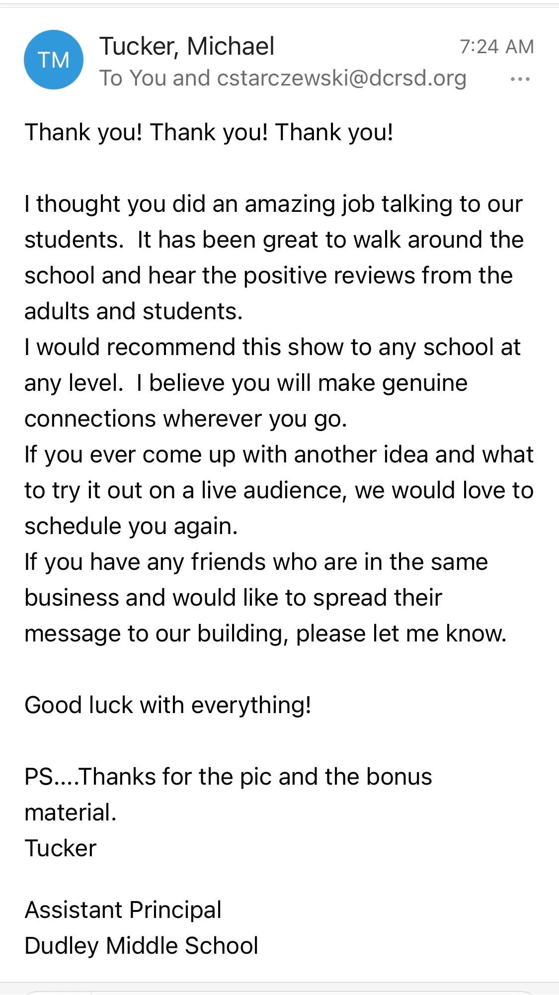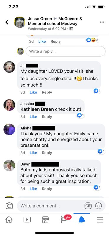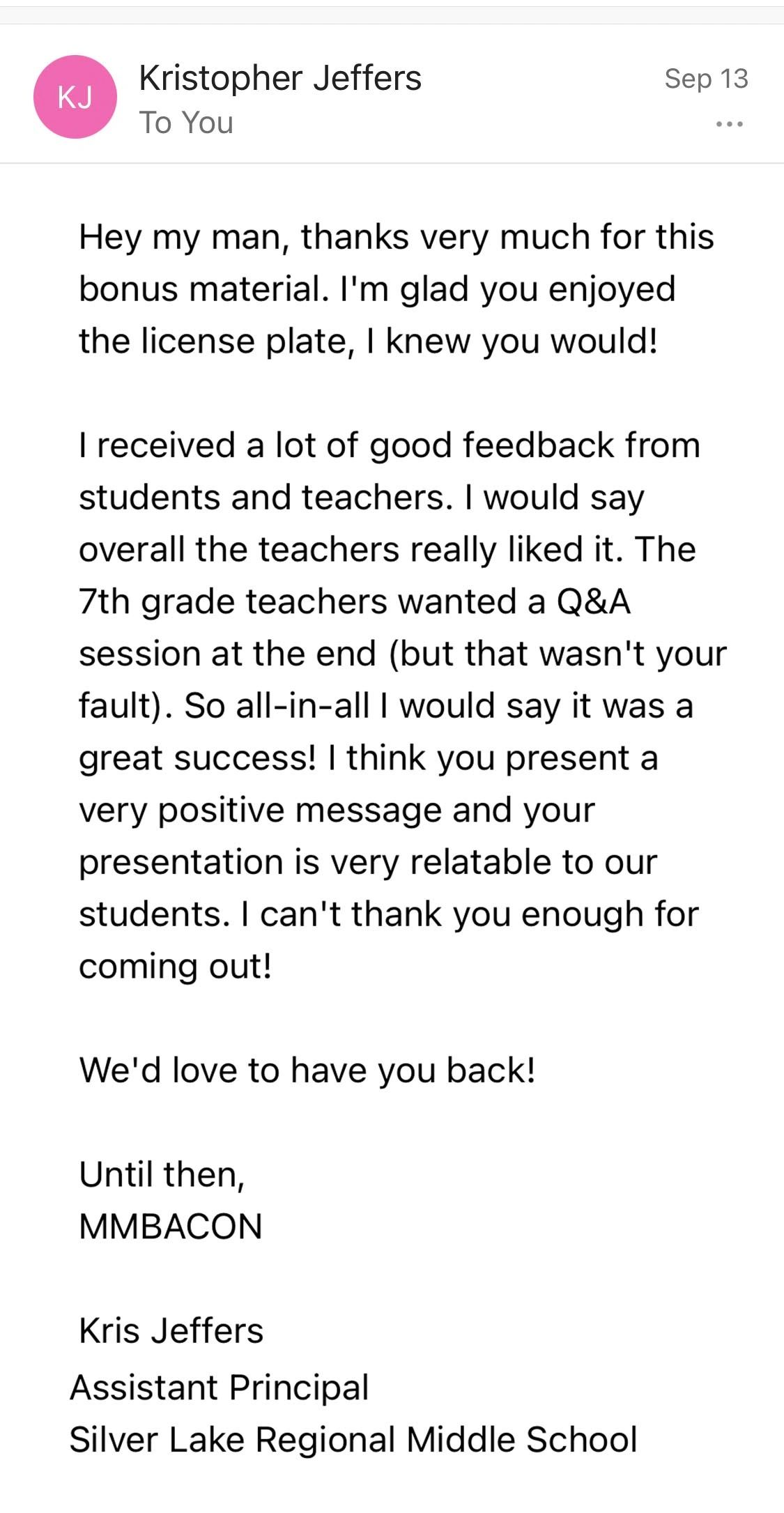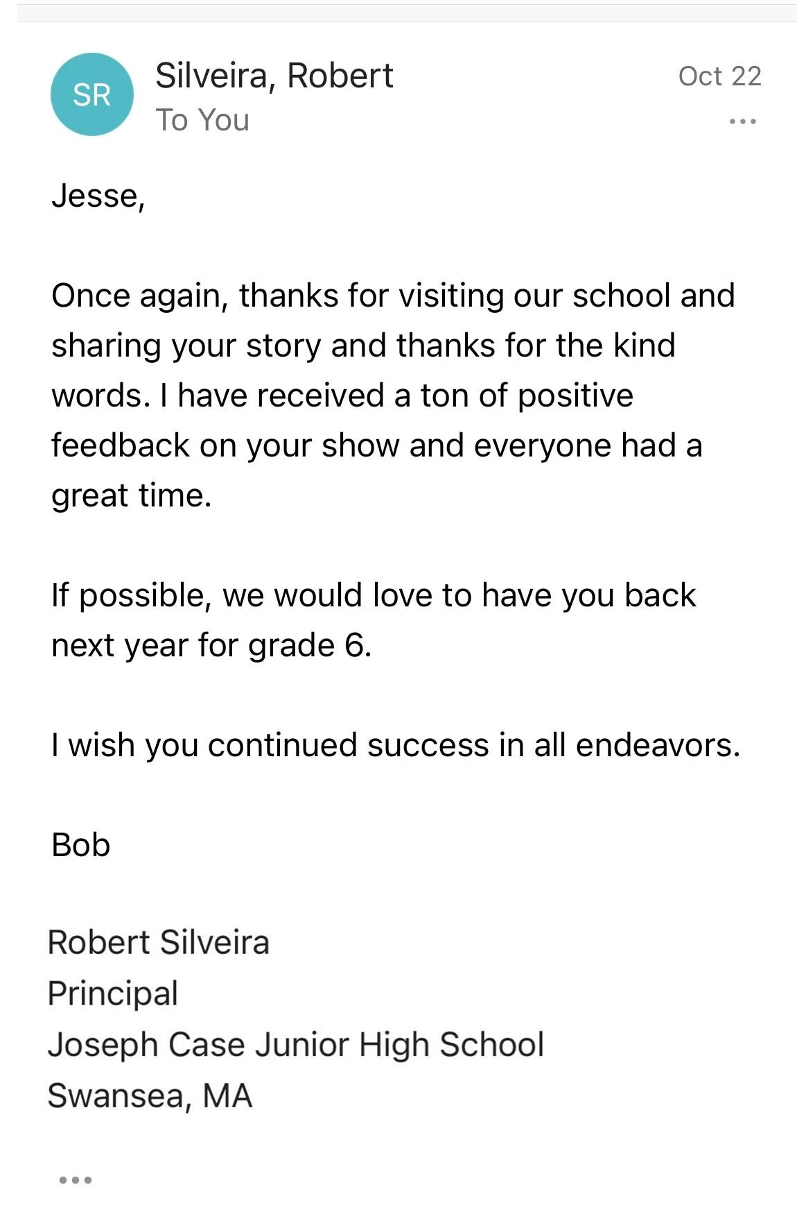 Seriously, Jesse, you were amazing! We are so lucky you came to speak today!! I cannot thank you enough! Your work you have done for kids and also veterans is simply heartwarming. Again, we loved having you! You are such a cool guy!!