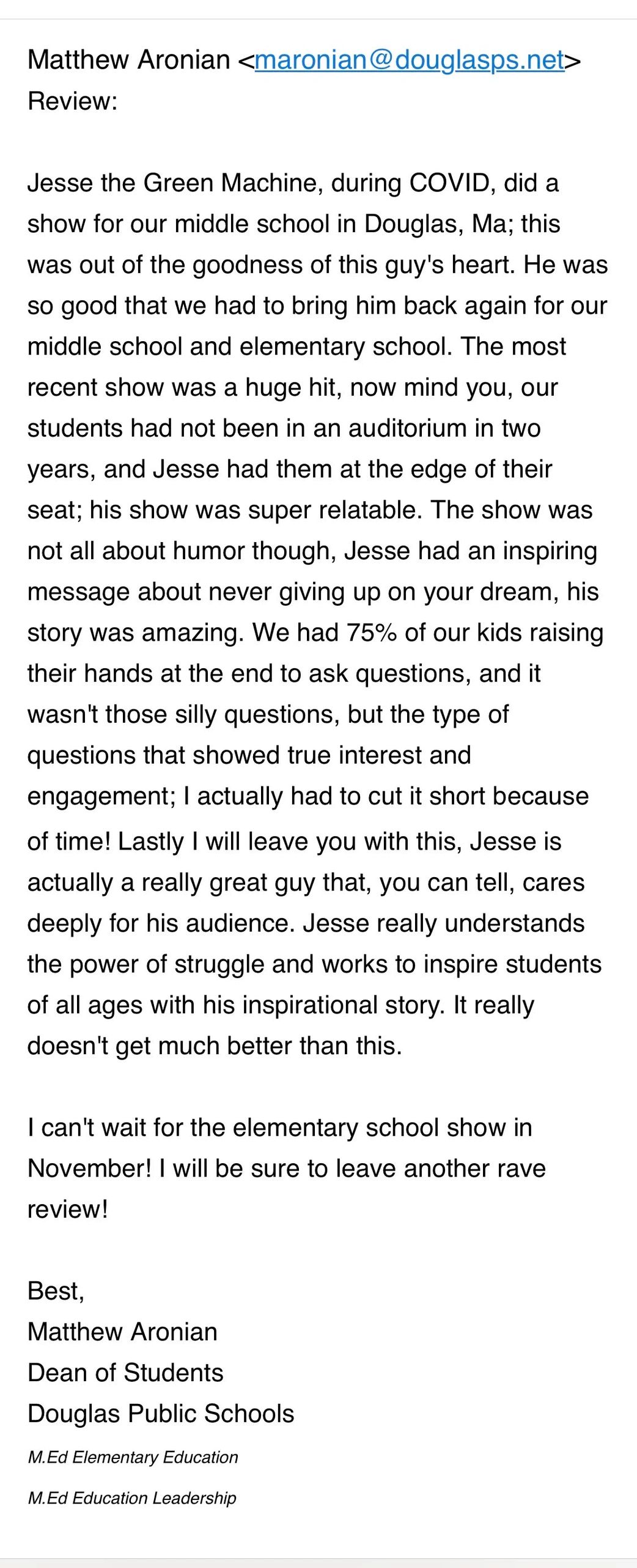 "The Machine" Jesse Green's entertaining presentation and wonderful personality had my son, his classmates, and all the teachers completely enthralled. More importantly, Jesse's message is _exactly_ what our children and youth need to hear -- that by combining goals with planning and perseverance, you can overcome obstacles and accomplish your dreams.